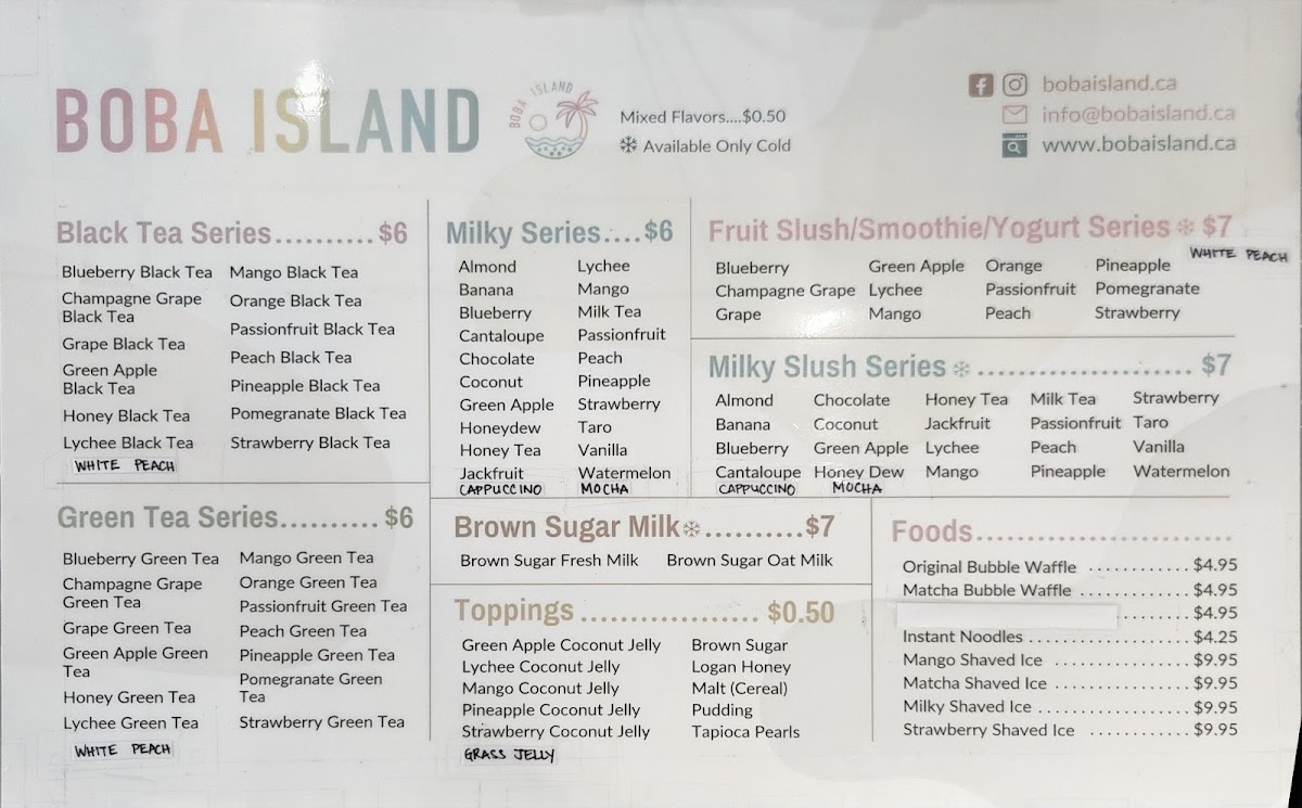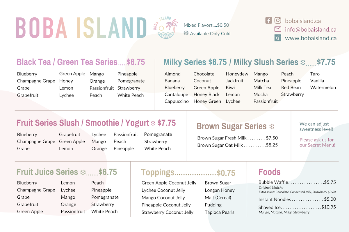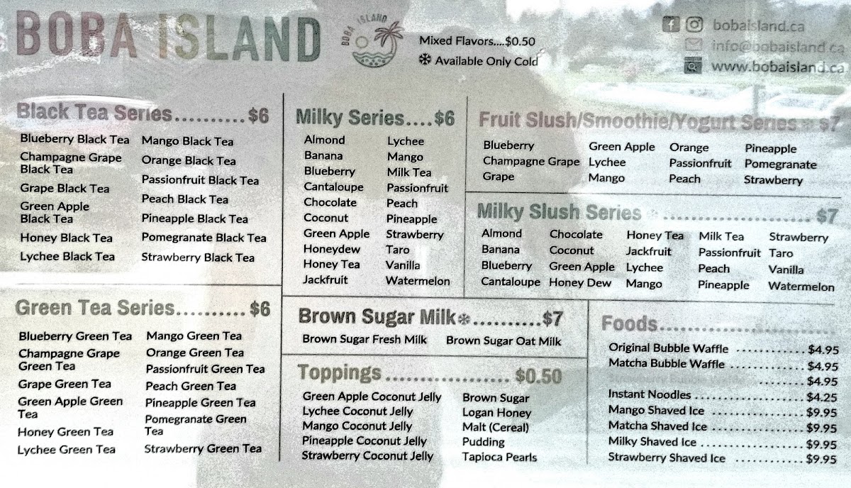 At Boba Island, the menu is packed with a variety of refreshing beverages and tasty bites that cater to every palate. For tea lovers, their Black Tea Series and Green Tea Series offer delightful flavors like Blueberry Black Tea and Champagne Grape Green Tea, along with other options such as Honey Green Tea and Green Apple Green Tea. For a creamy twist, the Milky Series features indulgent drinks like Almond Milk Tea and Honeydew Milk Tea, with the added bonus of popular choices like Mango Banana Milk Tea. The Brown Sugar Series offers rich, comforting drinks like Brown Sugar Fresh Milk and Brown Sugar Oat Milk. Customers can top off their drinks with a variety of fun options such as Lychee Coconut Jelly, Mango Coconut Jelly, and Pineapple Coconut Jelly. In addition to beverages, the food menu offers a selection of Bubble Waffles-choose between the classic Original Bubble Waffle or the matcha-infused Matcha Bubble Waffle. Other comforting choices include Instant Noodles and refreshing Shaved Ice, perfect for a quick snack or a light meal. With so many flavors to choose from, Boba Island is the perfect place to enjoy a unique and customizable boba experience.